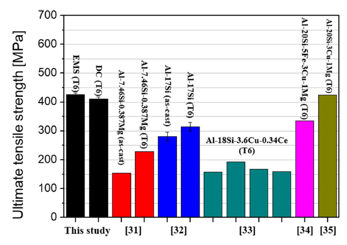 Comparison ultimate tensile strength (UTS) with other hypoeutectic/hypereutectic Al-Si