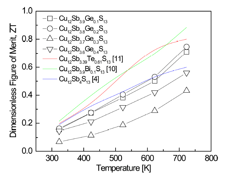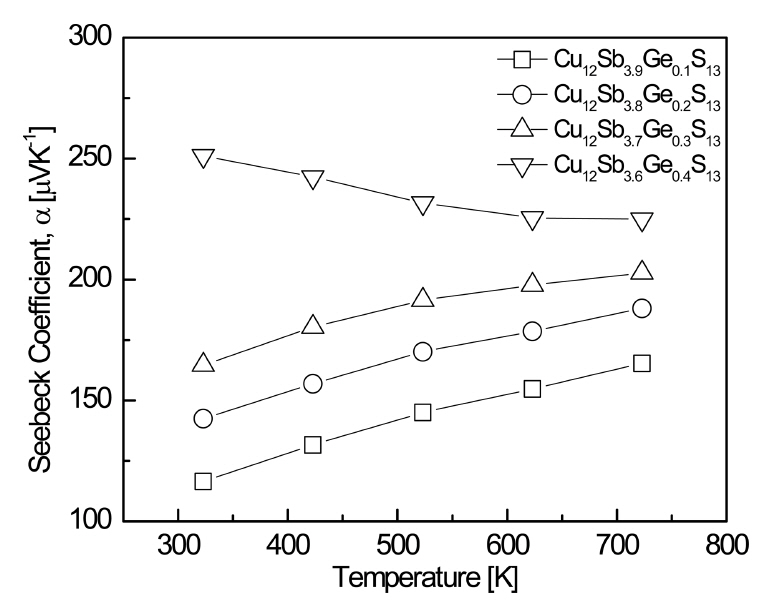 the Seebeck coefficient. In this study, Cu12Sb3.6Ge0.4S13 exhibited the highest Seebeck coefficient of 251–224 µVK-1 at 323–723 K, higher than