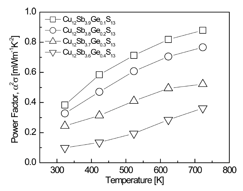 decreased. Cu12Sb3.9Ge0.1S13 exhibited a maximum power factor of 0.87 mWm-1K-2 at 723 K. However, when the Ge content increased, the effect of decreasing electrical