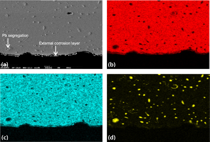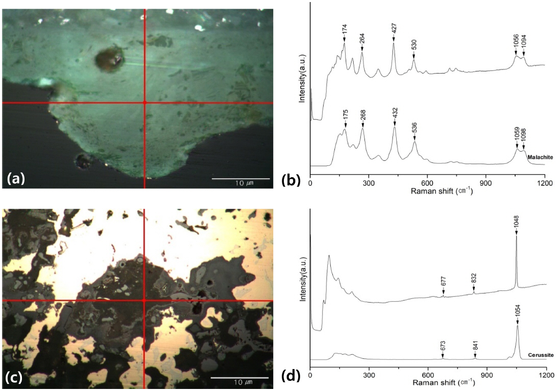 Cu-Sn-Pb 합금의 출토 청동유물의 경우 내부의 Pb 계열 화합물인 Cerussite(PbCO3)가 생성되었으며, Cu-Sn 합금의 출토 청동유물은 Pb 함량이 미미하여 확인되지 않았다. 출토 청동유물 내부에 불안정한 Pb 이온은 틈이나 기공