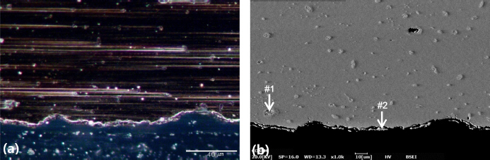 층위의 형태와 색상을 확인하고자 시료를 에칭하지 않고 광학현미경(EPIPHOT 200, NIKON, Japan)의 암시야(Dark Field)로 단면