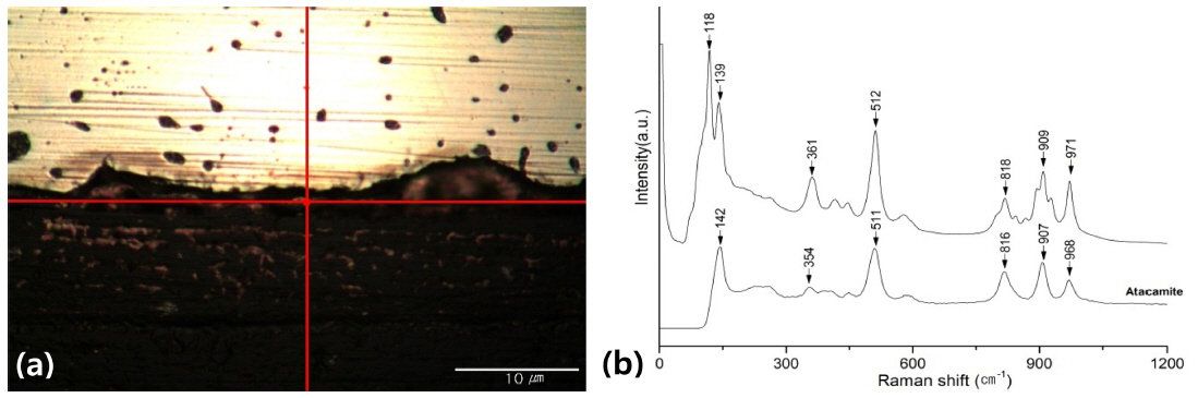 또한 부식생성물을 구성하는 화합물을 확인하고자 라만 마이크로 분광 분석기(LabRam ARAMIS, Horiba JobinYvon, Fra)를 이용하여