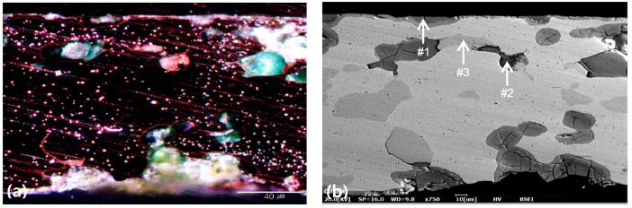 Sn 함량은 약 34.14 wt%로 상대적으로 높게 검출되었다 (그림 3b, 표 3). α상 선택 부식된 위치의 부식생성물은 라만 분광 분석 결과 554, 643, 683, 787, 1043 cm-1의 peak가 나타나며 일부 차이가 있으나 Cassiterite(SnO2)로 확인되었다 (그림 4a, 그림 4b). Sn은 내부 부식층에서 집중적으로 확인되며(그림 2c), 백색과 녹색의 부식생성물로 관찰된다 (그림 3a). 주요 성분은 Cu 10.73 wt%, Sn 70.11 wt%, O 14.85 wt%로 Sn 및 O의 함량이 높은 것으로 확인되었다 (그림 3b, 표 3). 내부 부식층의 라만 분광 분석 결과 α상 선택 부식된 위치의 부식생성물과 동일한 Cassiterite(SnO2)가 검출되었다(그림 4c, 그림 4d). Pb는 Cu-Sn 합금 특성상 노이즈 형태로 확인된다 (그림 2d).