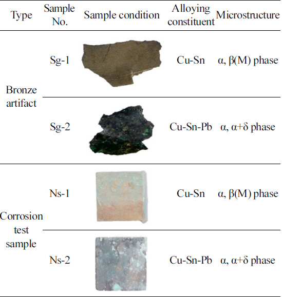 이에 따라 나타나는 부식 특성을 확인하고자 하였다. 또한 유사한 합금성분 및 미세조직으로 확인되는 출토 청동유물 및 부식 실험 시편을 비교하여 출토