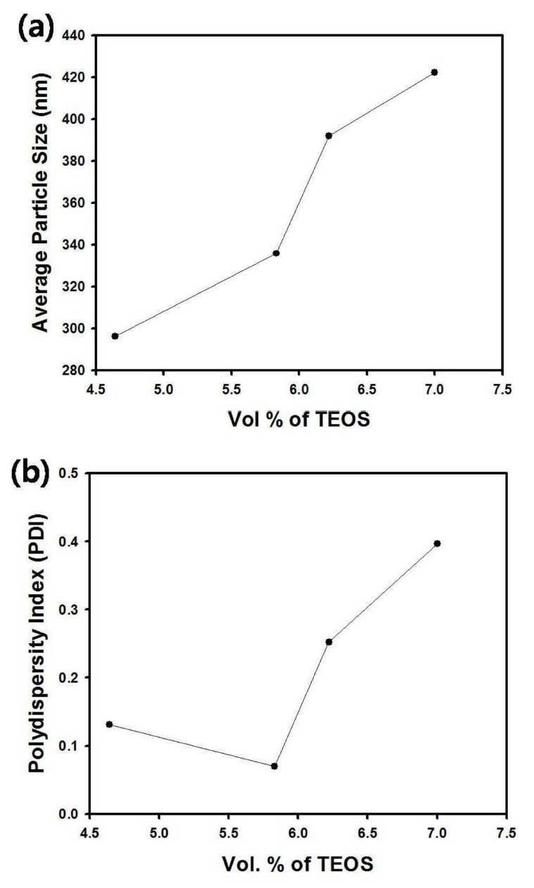with varying amount of TEOS. As the volume percent of TEOS increases, the size of