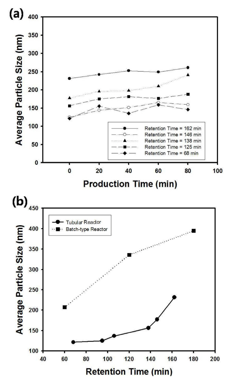 tubular reactor with 7.5 m in length. As displayed in the graph of Figure 3(a), the particle size fluctuates as a function of production time for the short retention