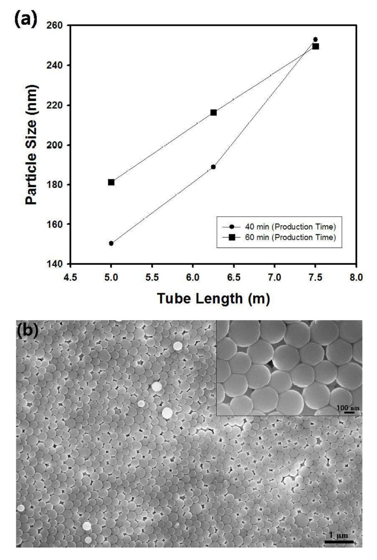 Figure 3(a) contains the average size of the silica nanospheres as a function of production time.