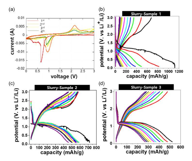 위해 12시간 방치되었으며 이후 100 mA/g의 전류밀도에서 0.05~3 V vs. Li/Li+ 범위에서 충/방전이 진행되었다. cyclic voltammogram (CV) 커브는 0.1 mV/s의 스캔속도로 0~3 V vs. Li/Li+ 범위에서 측정되었으며 CV와 배터리 충/방전 실험은 각기 다른 샘플로 진행되었다.