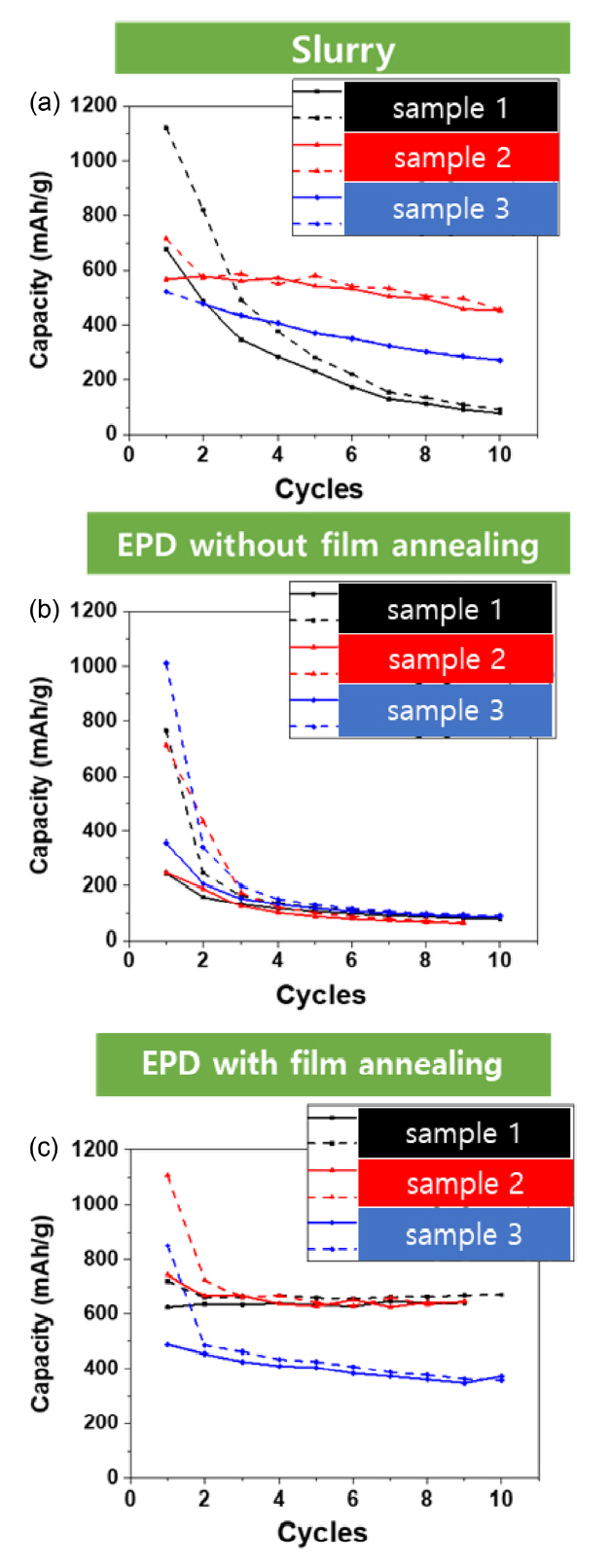 필름 열처리를 한 EPD 전극의 경우는 급속 냉각한 시편이 가장 낮은 용량과 낮은 안정성을 보여주었지만 여전히 같은 조건에서 급속 냉각한 slurry