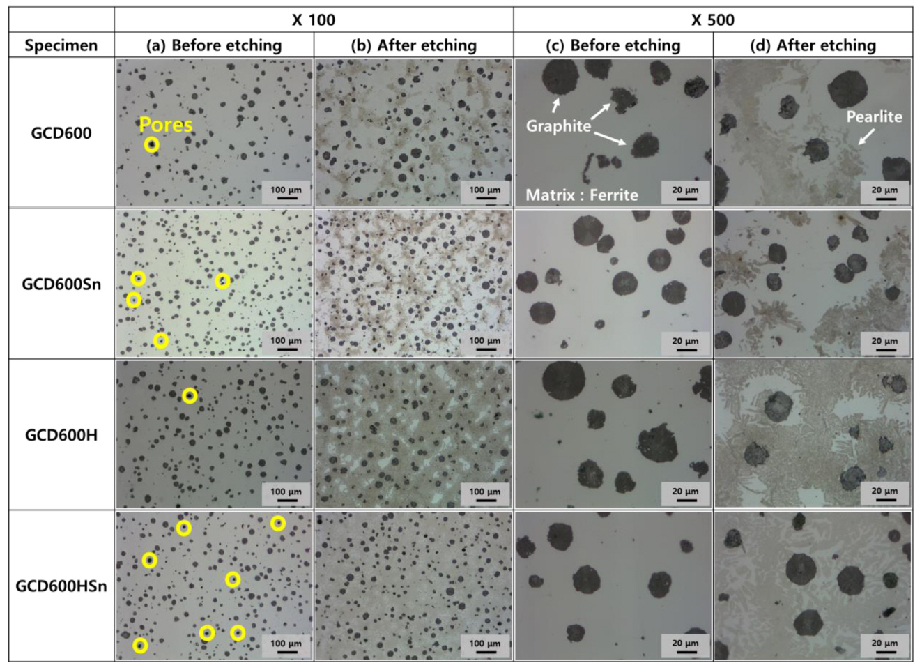 were labeled as GCD600 (as-cast state testing material), GCD600Sn (Sn-added testing