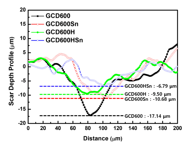 GCD600Sn specimen increased slightly to approximately 30–50 HV. In contrast, the yield