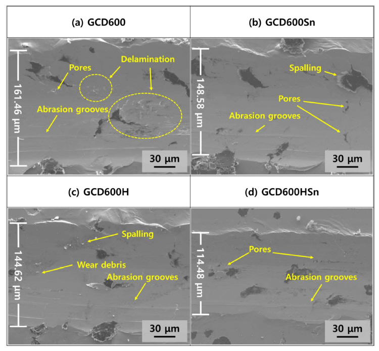 The GCD600HSn specimen exhibited the narrowest abrasion width of 114.48 µm (Fig 7d), and the friction between the specimen and the pins proceeded without spalling of