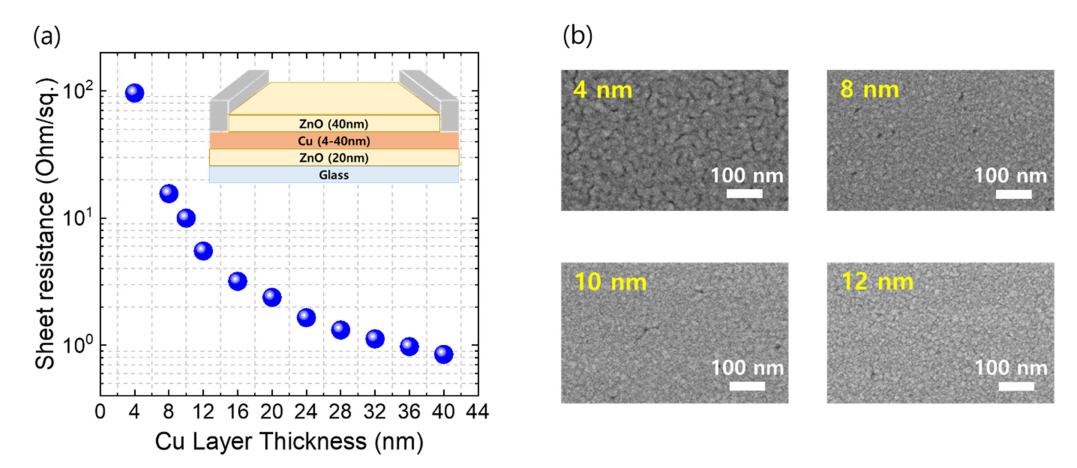 변경시킬 때의 면저항 측정 결과이다. Fig 1(b)는 4, 8, 10, 12 nm 두께를 가지는 Cu층의 형상을 보여주는 FE-SEM 이미지이며, 12 nm의 두께에 도달하기 전에는 아직 완벽한 연속박막을