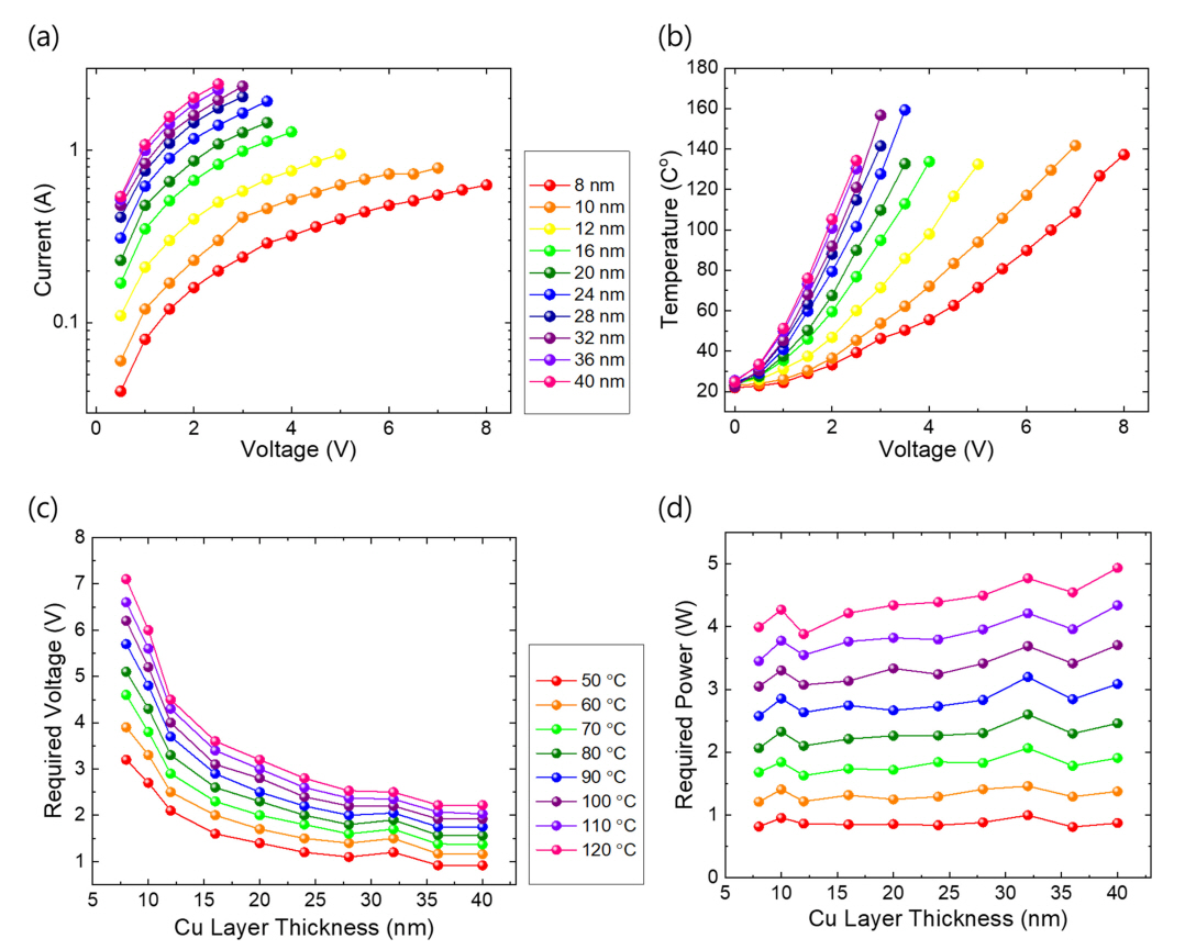 결과 고온 (>100 °C)에서도 매우 안정적인 구동이 되는 것을 확인하였다. 또한, Cu 박막의 두께와 관계없이 특정온도에 도달하는 데 필요한 전력은