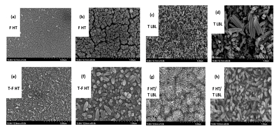 as indicated in Figures 1 (c) and (d). The T-F HT/ FTO sample presented in Figures 1 (e) and (f) exhibits short urchin-like structures. Figure 1 (g, h) presents sample F HT/ T LBL/ FTO that was synthesized by both LBL and HT methods