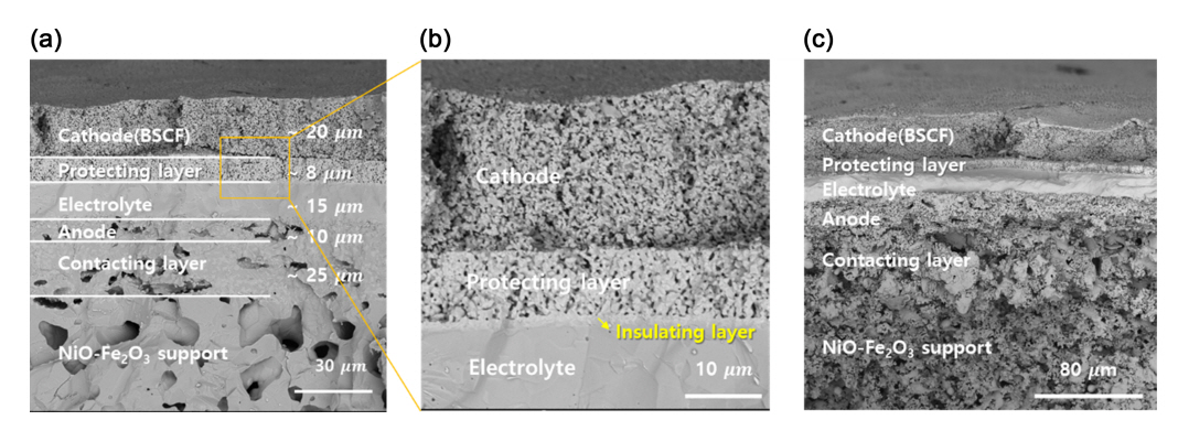 양극은 약 20 mm의 두께로 다기공 구조로 형성되었다. 한가지, BSCF 양극은 구성 원소인 바륨 (Ba)과 스트론튬 (Sr)이 지르코니아 고체전해질과