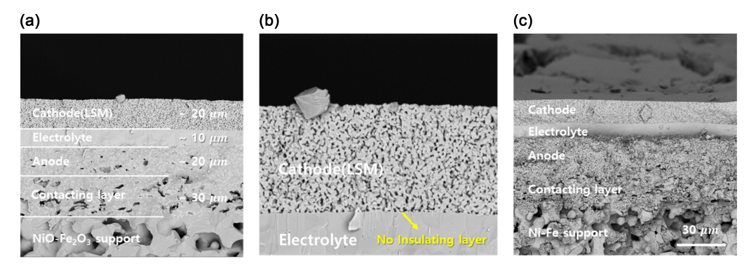 보고된 Ni-Fe 금속지지형 SOFC 구조 : 양극/고체전해질/음극/Ni-Fe 금속지지체. 본 연구의 SOFC 구조 : 양극/고체전해질/음극/콘텍층/Ni-Fe