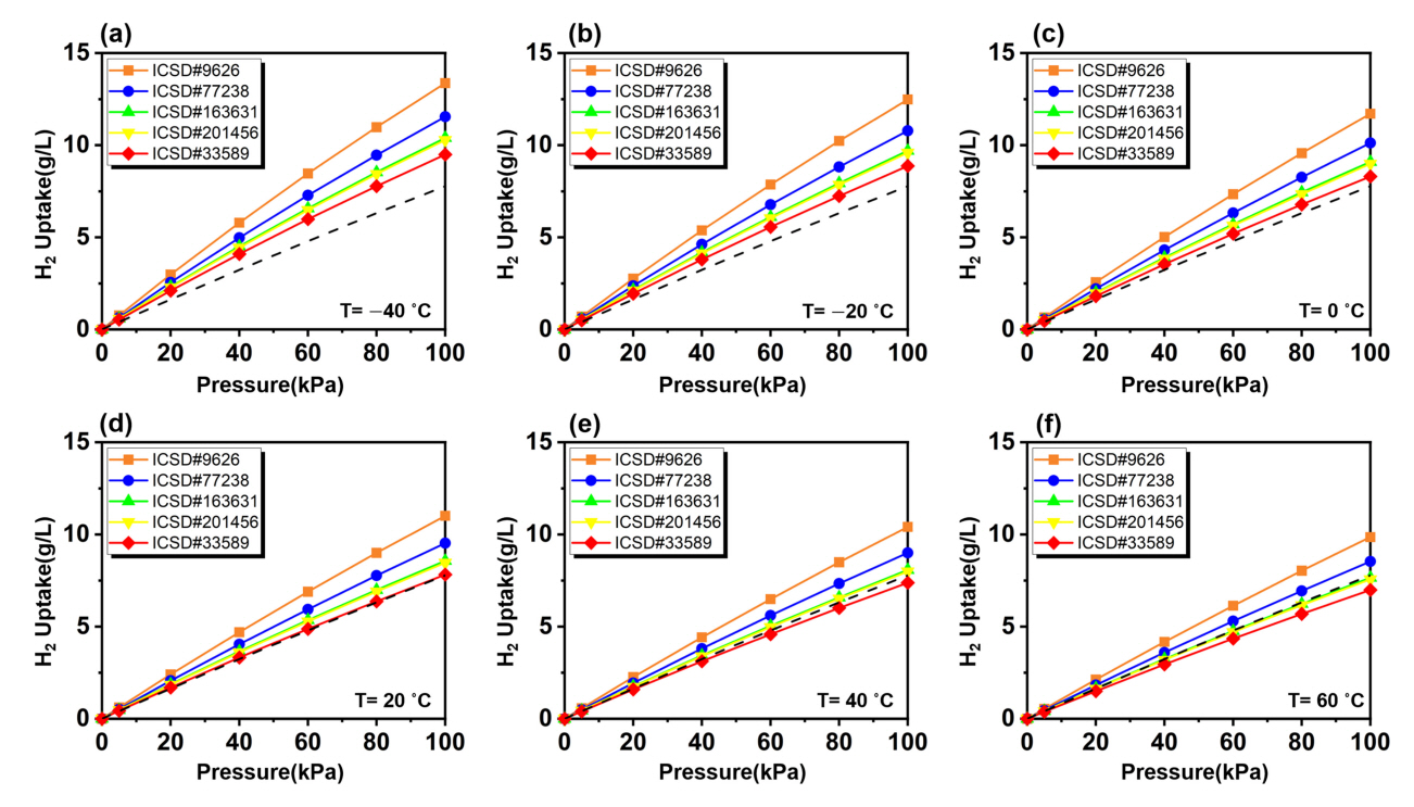 0 bar부터 100 bar까지의 수소 흡착량 그래프로 나타냈다. 먼저 ICSD#9626에 해당하는 제올라이트가 모든 작동 온도 조건에서 가장 큰
