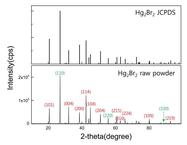 Material characterization of Hg2Br2. The Hg2Br2 powder and crystal were characterized by XRD (JP/SmartLab, Rigaku, Tokyo, Japan)
