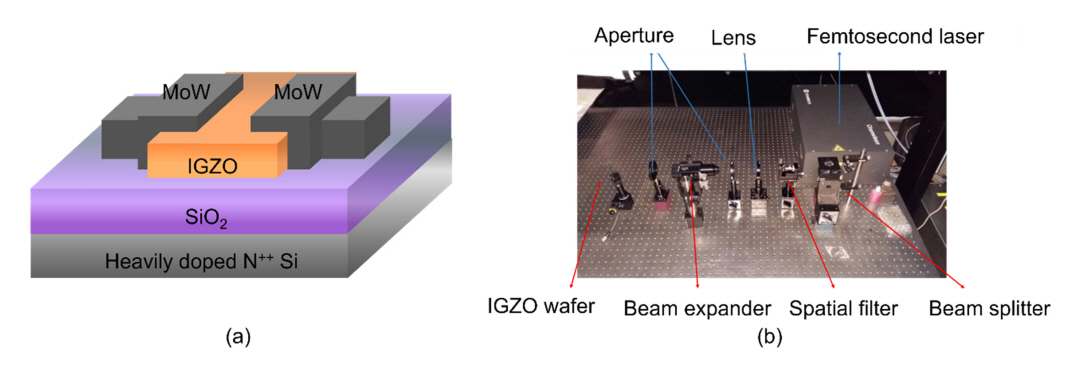 (a) Schematic diagram of IGZO active layer-based TFT, and (b) laser system (Ti:Sapphire