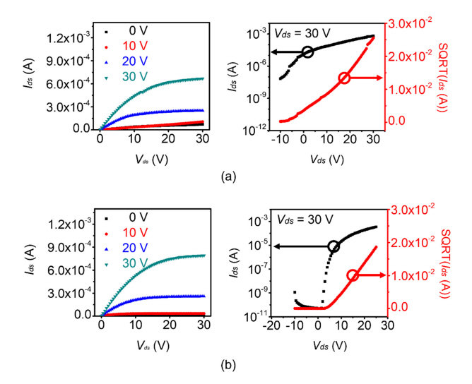 Output & transfer characteristics Ids – Vgs curves of IGZO TFTs by laser post-annealing (a) without post-annealing, and (b) with