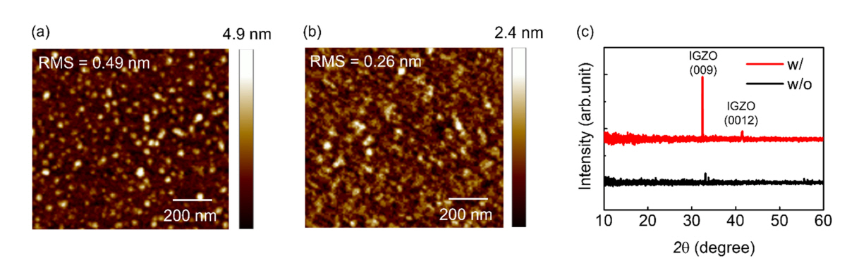 (b) with post-annealing, and (c) XRD diffraction patter of IGZO films with and without