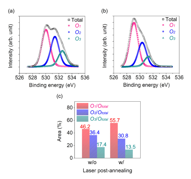 XPS spectra O1s peaks of the IGZO TFTs by laser post-annealing with or without laser