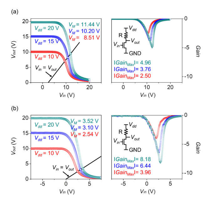 inverter for supply voltages (a) without post-annealing, and (b) with post-annealing.