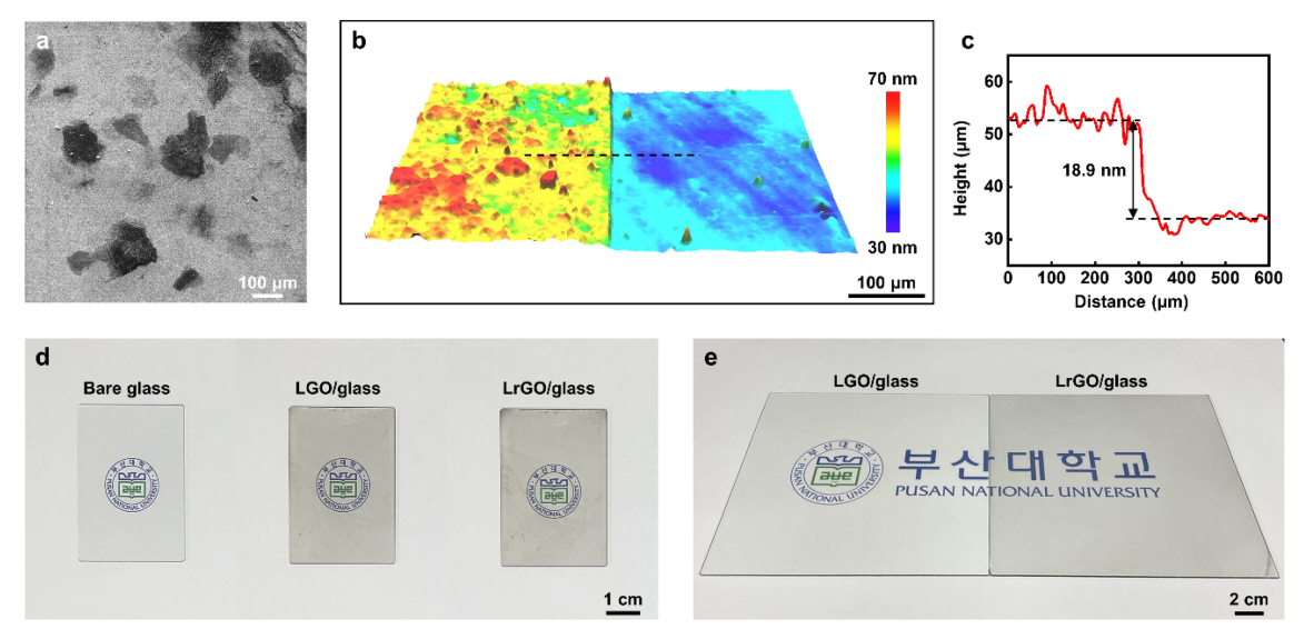 in (b). (d) Photograph of the bare glass, LGO/glass, and LrGO/glass. (e) Photograph