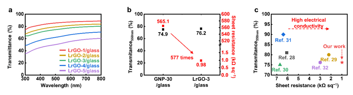 Optical and electrical characterizations. (a) Transmittance of LrGO/glass at a visible