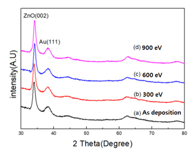 below 200 °C. However, all of the ZAZ films in Fig 2 show diffraction peaks for ZnO (002) and Au (111) regardless of electron irradiation