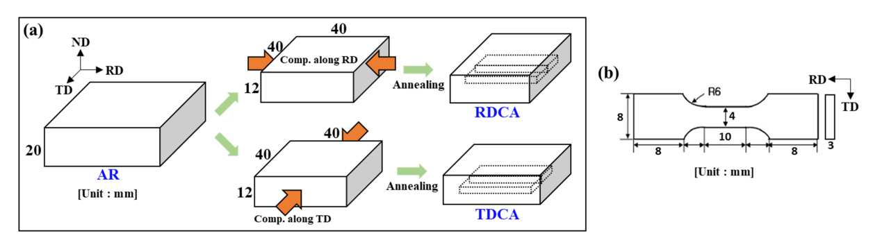 실시하였다. 이렇게 RD와 TD로 선압축 후 열처리한 시편을 각각 RDCA과 TDCA으로 명명하였다 (그림 1(a)).