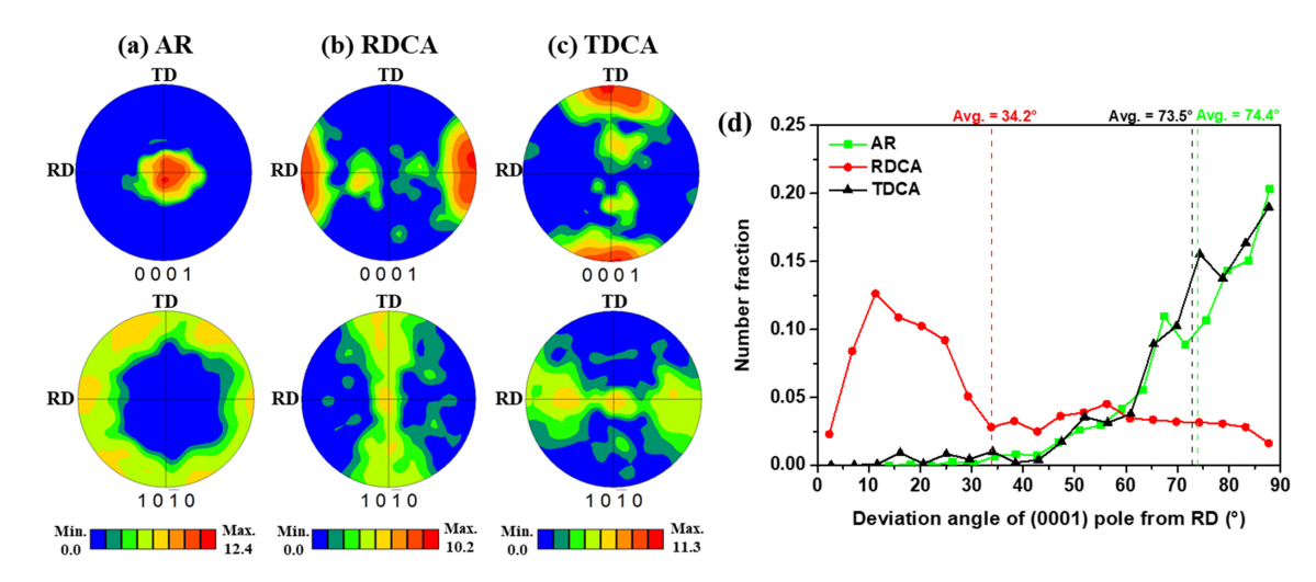 (0001) and (10–10) pole figures of (a) AR, (b) RDCA, and (c) TDCA samples. (d) Number