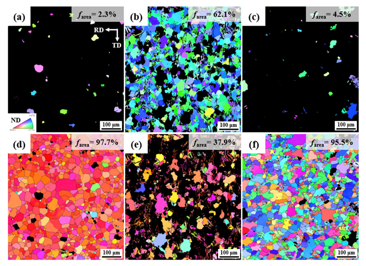 그림 2(a)-(c)는 각각 AR, RDCA, 그리고 TDCA의 역극점도 지도(inverse pole figure map, IPF map)를 나타낸다. AR의 대부분의