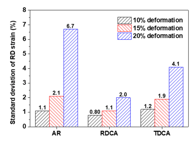Standard deviations of RD strains of tensile samples deformed to strains of 10, 15,