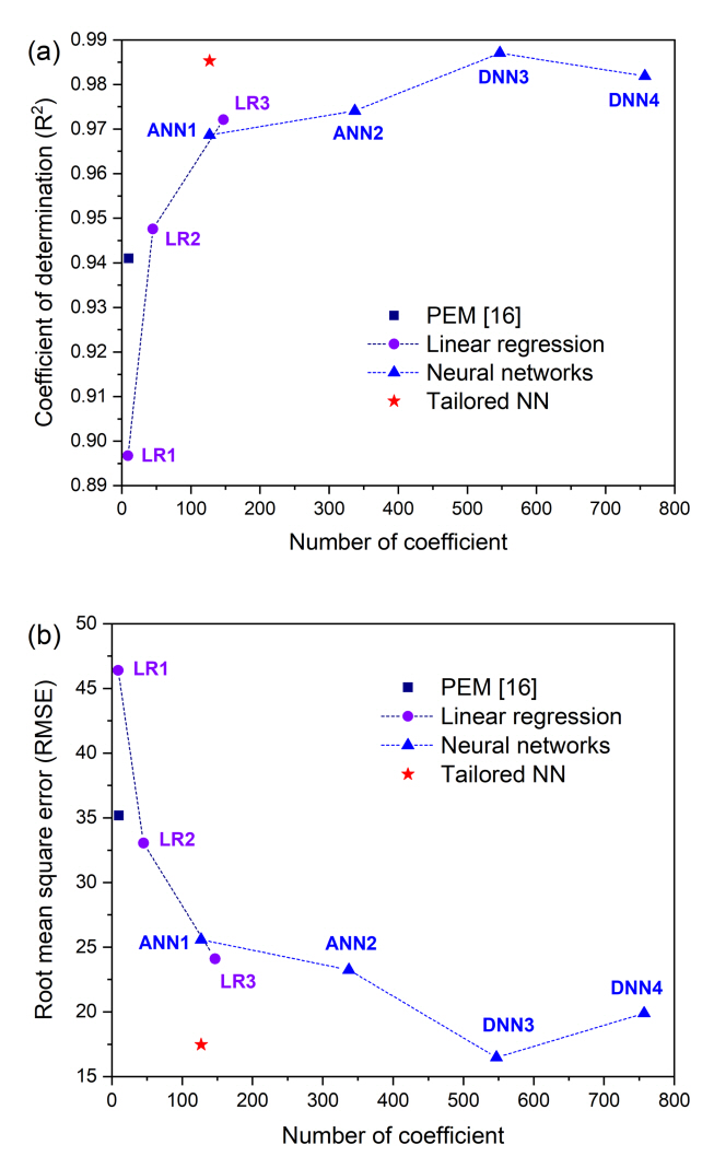 and (b) root mean square error depending on predictive model.