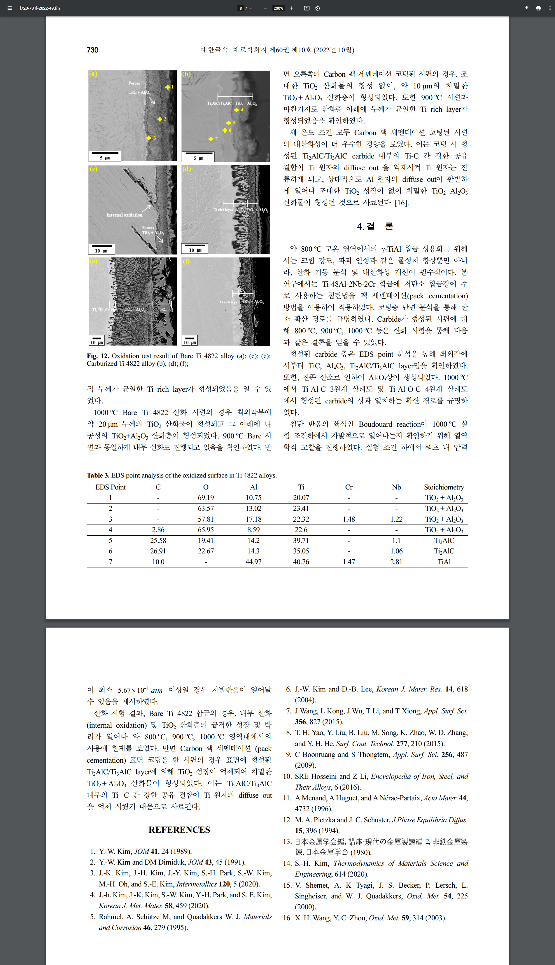 온도별로 거의 동일한 값을 나타낸다 [5]. 그러므로 산화 초기에는 TiO2 와 Al2O3 산화물이 비슷한 분율로 생성되지만, TiO2 산화물의 성장속도가 Al2O3 산화물에 비해 빠르므로, 생성과 동시에 급격히 빠르게 성장한다. 그러므로 TiO2 산화물은 TiAl 합금 표면에 Al2O3 부동태 형성을 방해하며 조대한 산화물로 성장하게 된다.