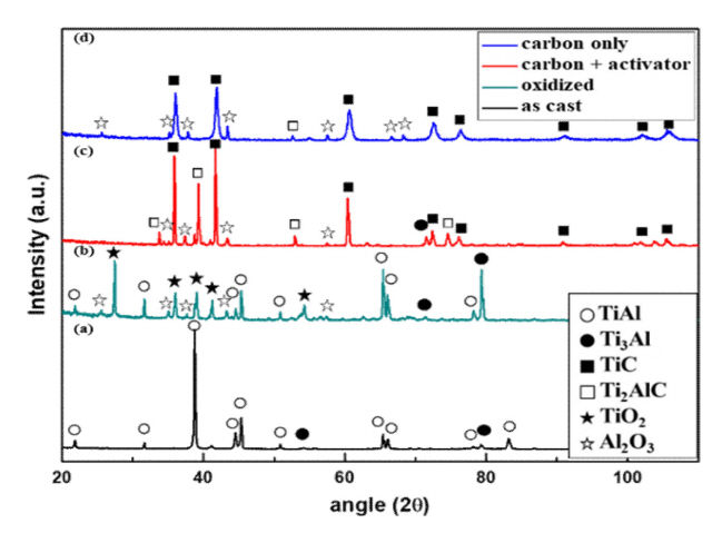 그림 3은 모합금, 산화 시편, 팩 세멘테이션 시편 표면에 대한 XRD 분석 결과이다. 모합금 표면에는 γ (L10)와 α 2 (D019) 상이 형성되었다. 반면, 대기중에서 1000 °C 24시간 산화된 시편의 표면에는 γ 와 α 2 peak 이외에도 TiO2 및 Al2O3 산화물 peak이 검출되었다. 팩 세멘테이션 시편의 경우, TiC상의 형성이 확인되었으며, 활성제를 함께 넣은 시편의 TiC peak이 carbon