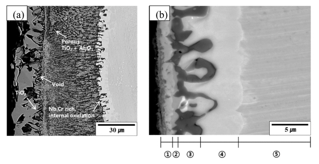 모합금의 산화를 막아주는 역할을 한다. 반면 TiAl 합금의 경우, 온도별 Ti / TiO2, Al / Al2O3 평형 산소 분압이 거의 일치하기 때문에, 치밀한 Al2O3가 모재 표면에 우선적으로 생기지 않고 TiO2, Al2O3 산화물이 동시에 생성되는 특징이 있다. 특히 TiO2 산화물은 Al2O3 산화물에 비해 성장속도가 빠르고, 모합금과의 열팽창 계수 차이가 크다는 특징이 있다. 이로 인해 TiO2 산화물이 반복적으로 생성 및 박리되어 고온 영역에서 γ -TiAl 합금 사용을 어렵게 만드는 주요 요인으로 작용한다 [5]. 이에 많은 연구자들이 TiO2 생성 억제를 통한 TiAl 합금의 내산화성 개선 연구를 다각도로 진행하고 있다.