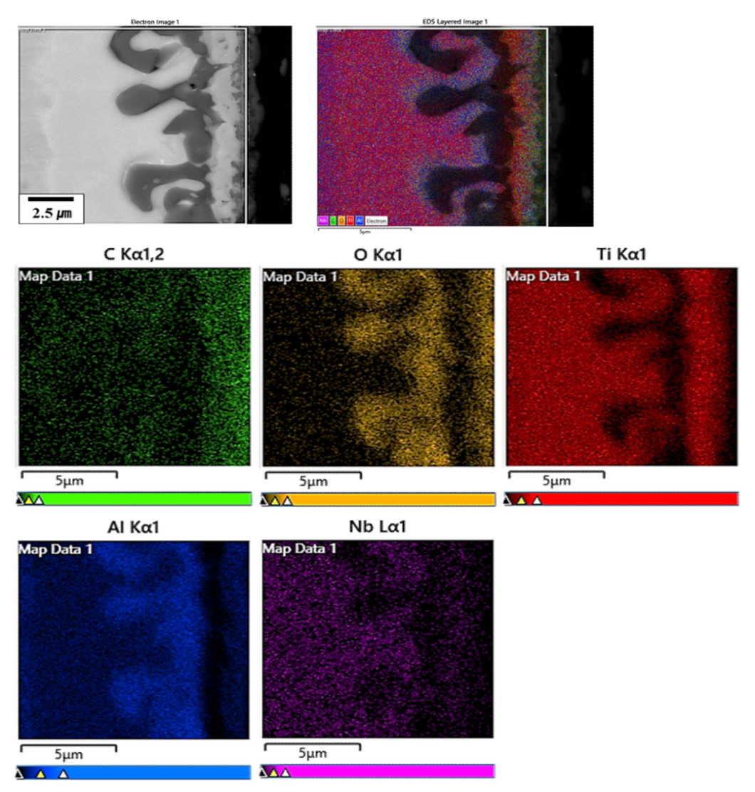 사료된다. TiC layer 아래에는 유동 형태의 Al2O3 산화물이 생성되었고, Al2O3 산화물 아래에는 다시 Carbon rich 영역과 Titanium rich 영역이 나타나는 것을 확인하였다. 보다 상세한 분석을 위해 각 부분별