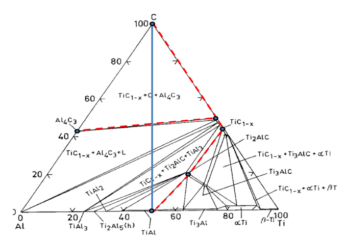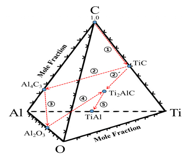 EDS point 분석을 바탕으로, 그림 7의 1000 °C Ti-AlC 3원계 상태도 상에서 탄소 확산 경로를 추적해보았다[12]. 먼저, 확산의 출발점인 Carbon과 도착점인 γ -TiAl 상을 파란색 실선으로 직선으로 연결하였다. 확산 경로는 빨간색 점선으로 표시하였는데, 100% Carbon 영역에서부터 TiC / Al4C3 / Al2O3 / Ti2AlC / TiAl 순이다. 그림 6의 단면 미세조직에서 알 수 있듯이, Al4C3의 경우, Al2O3 산화물과 함께 형성되므로, Ti-Al-O-C 4원계 상태도를 고려해야 한다. Al2O3 산화물을 고려한 4원계 상태도 상의 확산 경로는 그림 8과 같다.