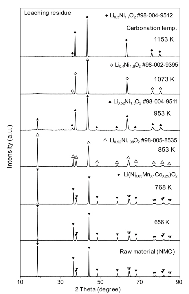 NCM과 거의 동일한 것으로 생각된다. 853 K에서는 NCM과 유사하지만 Li이 Li2CO3가 되어 침출되었기 때문에 Li이 약간 부족한 Li1-xM1+xO2의 새로운 NCM상이 생성된 것으로 추정된다. 그 이상의 온도에서도 Li의 감소에 따라 Ni이 높은 NCM이 생성된 것으로 추정된다. 이러한 결과는