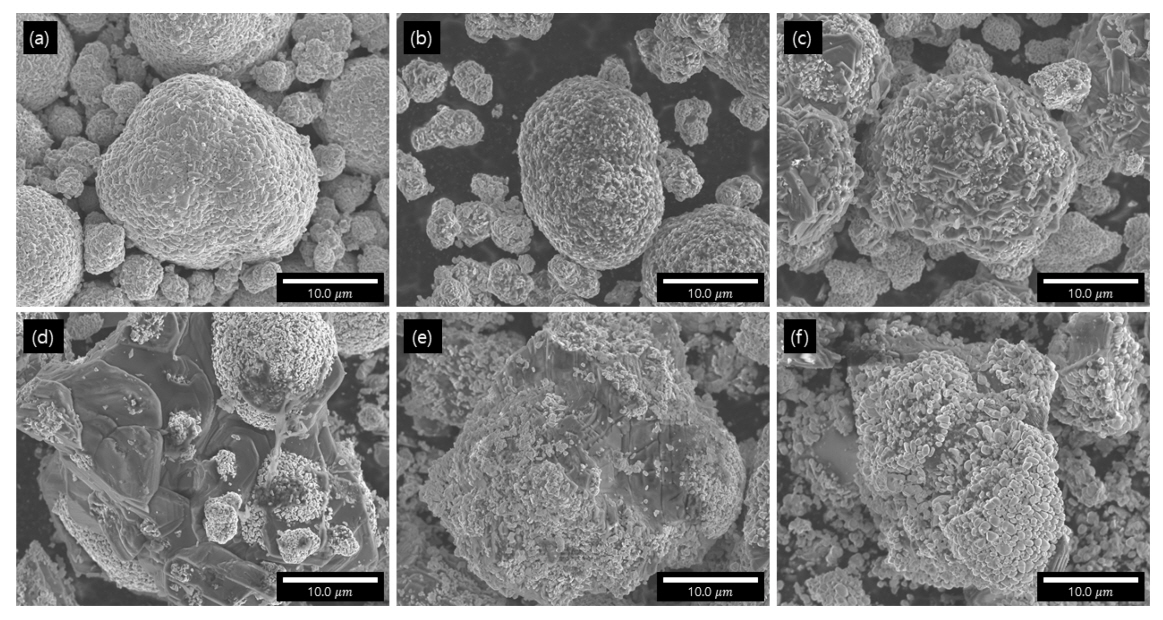 K(c)에서는 원시료의 형태가 붕괴되면서 입자 표면에 Li2CO3의 결정이 생성되기 시작하였으며, 일부 1 µm 이하의 미세한 입자가 부착되어 있어다. 그리고 953 K 이상에서는 Li2CO3의 결정이 용융된 후 응고된 형상을 보이며 표면에 직경 1 µm 이하의 입자들이 집합체를 형성하고 있었다. 수침출 후 잔사를 관찰한 결과 이러한 1
