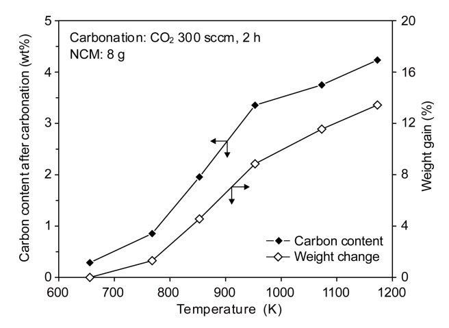 것을 알 수 있다. 이러한 결과는 반응 온도의 상승과 함께 NCM의 분해 반응이 보다 활성화되고 더욱이 CO2 분위기에서 탄산화 반응이 촉진되었기 때문으로 생각된다.