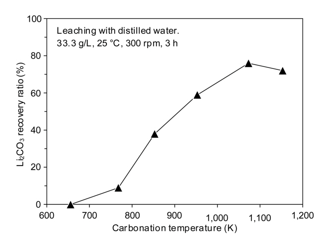 Li2CO3의 물에 대한 용해도는 상온(25 °C)에서 12.8 g/L이며, 온도의 상승과 함께 오히려 감소하는 경향을 보이며[2], 100 °C에서는 7.2 g/L이므로 침출액을 가열하여 수분을 증발시키면 고체상태의 Li2CO3를 회수할 수 있다. 그림 8에는 탄산화 배소한 후의 시료를 증류수 중에서 3시간 동안 침출한 후 여과한 여액을 증발시켜 회수한 Li2CO3의 회수율에 미치는 탄산화 배소 온도의 영향을 나타내었다. 그림 6에 나타낸 바와 같이 656 K에서는 탄산화 반응이 거의 일어나지 않았으므로 Li2CO3가 전혀 회수되지 않았으나, 탄산화 배소 온도가 상승함에 따라 [C] 농도와 시료의 무게가 증가한 것과 동일한 경향으로 Li2CO3의 회수율도 상승하였다. 그러나 시료 중의 [C] 농도는 온도와 함께 계속 상승하였으나, Li2CO3의 회수율은 1,073 K에서 최곳값(76%)을 보인 후 약간 감소하였다.
