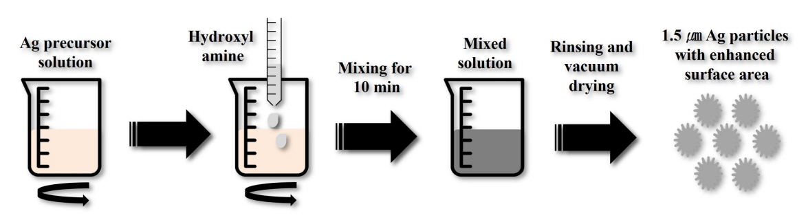 표면적이 발달된 1.5 μm Ag 입자의 제조 방법은 다음과 같았다. 100 ml의 증류수에 Ag 전구체인 질산은(AgNO3, Hojeonable Inc., 99.99%)을 용해시켜 0.1 M의 Ag 용액을 준비하였다. 이후 250 rpm의 교반을 유지하며 환원제인 하이드록실아민(hydroxylamine,
