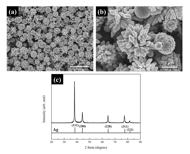 그림 3(a)와 3(b)는 합성된 Ag 입자의 저배율 및 고배율 주사전자현미경 이미지이다. 합성된 Ag 입자의 평균 입도는 약 1.5 μm로 측정되었으며, 표면적이 발달된