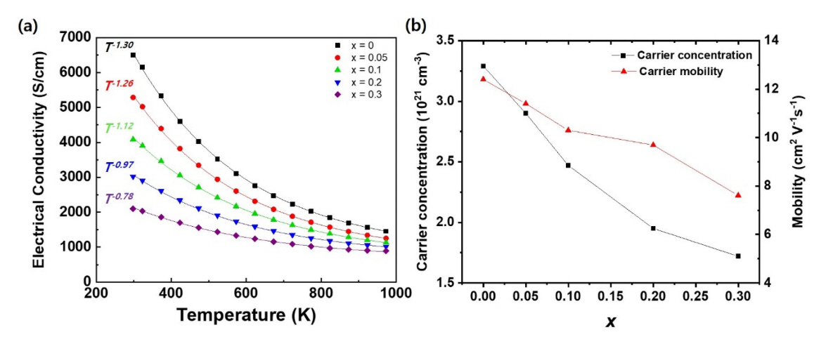 the increasing effect of alloy scattering with the addition of V [12,13,15,21]. Figure 3(b) shows the plots of the carrier concentration and mobility at 300 K as functions of