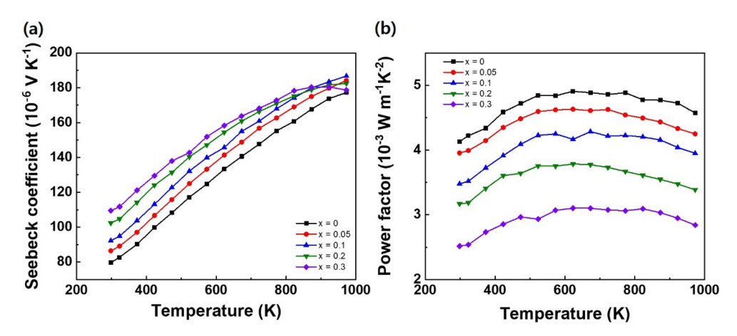 Figure 4(b) shows the power factor (PF) calculated using the formula PF = σS2. The V-free sample has the highest PF, and almost constant values of 4.85–4.90 mW m−1K−2 are obtained in the temperature range of 523–773 K. By comparison, the V-added samples
