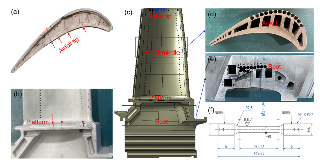 of the blade with the selected positions for microstructural characterizations. (d,